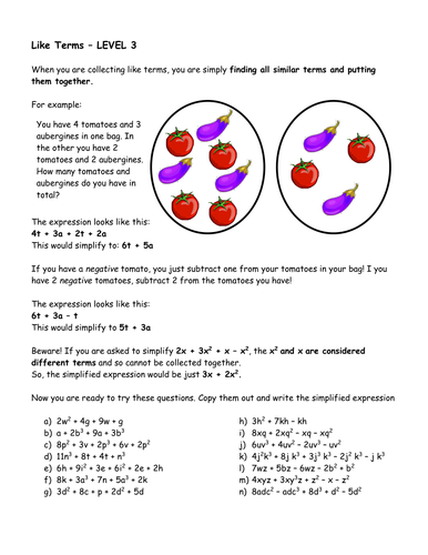 Showing top 8 worksheets in the category - Collecting Like Terms Algebra. In addition to the resources listed below see my blog post Introducing Algebra for more ideas. This website and its content is subject to our Terms and Conditions.