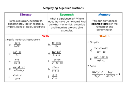 Simplifying Algebraic Fractions Homework Teaching Resources